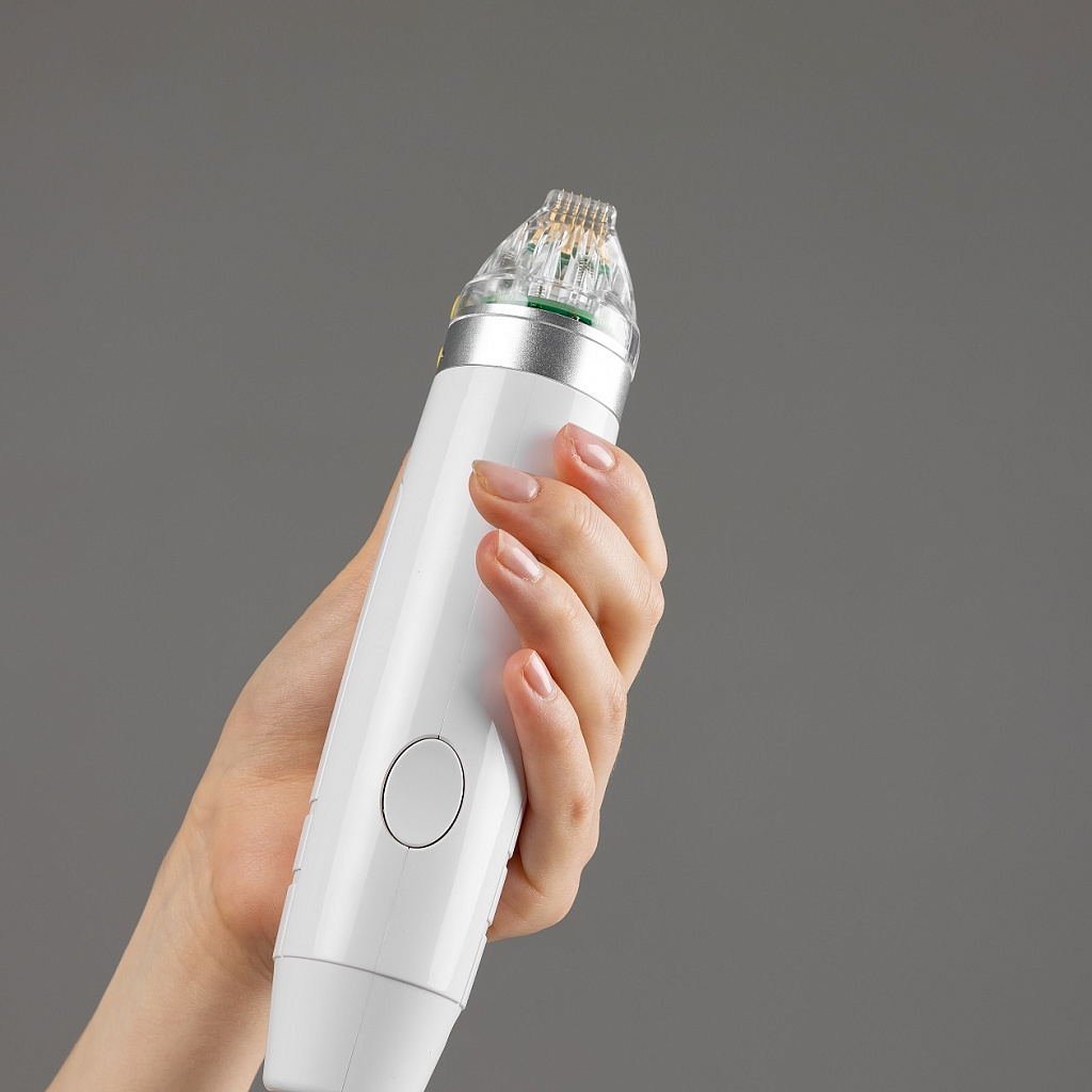 Безболезненность: Уникальная конструкция насадки ANTIGE с активными и пассивными (возвратными) электродами минимизирует болевые ощущения, обеспечивая комфорт во время процедуры. Моторизированный механизм плавного погружения игл на глубину до 4 мм гарантирует гладкость движений, высокую скорость обработки кожи и комфорт для пациента.